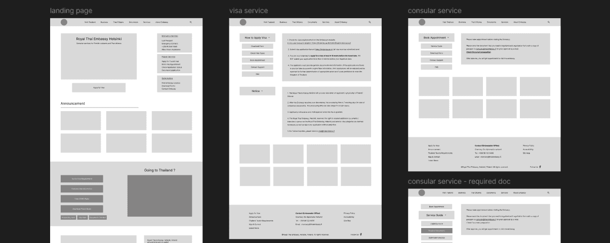 Wireframed the first design in Figma, focuses on 3 core pages: Home, Visa service, and Consular service.